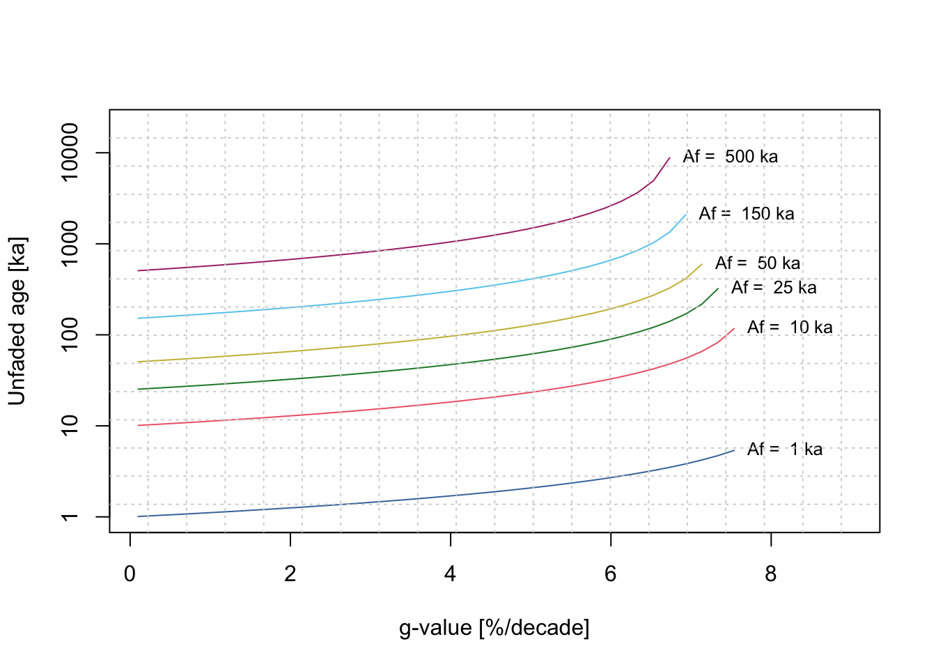 Let’s go back to the graph above and imagine an age affected by fading of 10 ka (lower red line in the graph) and an assumed \(g\)-value of 7.5 %/decade for \(t_c = 1\). The fading correction would yield an unfaded age \(> 100\) ka, with a significant uncertainty (not shown in the graph).